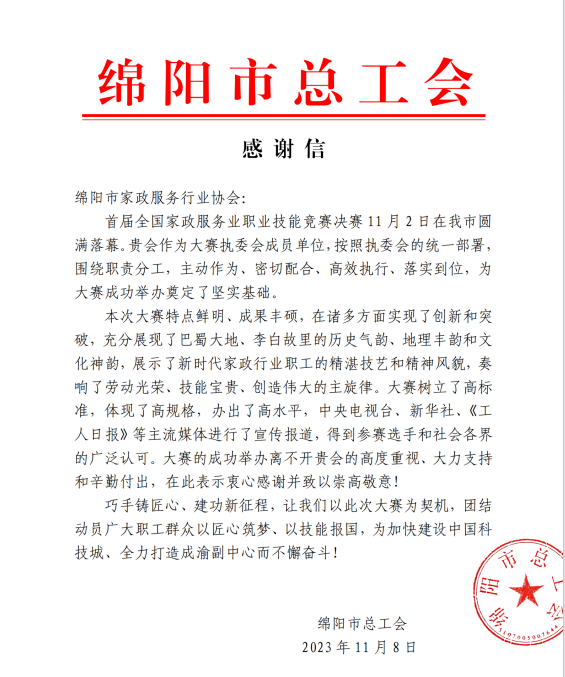 綿陽市家政服務行業(yè)協(xié)會力助首屆全國家政服務業(yè)技能競賽決賽在綿陽圓滿落幕,綿陽市總工會高度贊揚,綿陽市美新家政熱烈祝賀!